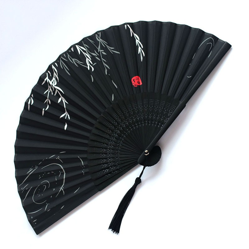 (Loại 50) Quạt cổ trang dây tuyến lá liễu ven hồ vải lụa xếp cầm tay quà tặng Trung Quốc xinh xắn free ship